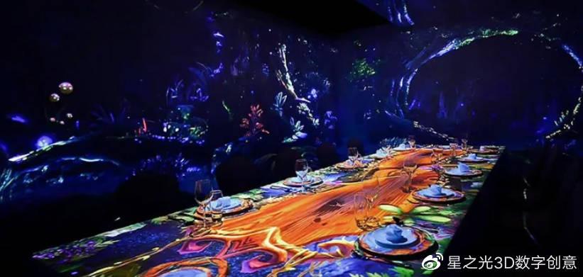 沉浸式光影餐廳,加上美味佳肴,配合炫酷的光影餐廳,將高科技與美味完美融合,更能吸引用戶的目光與青睞。
